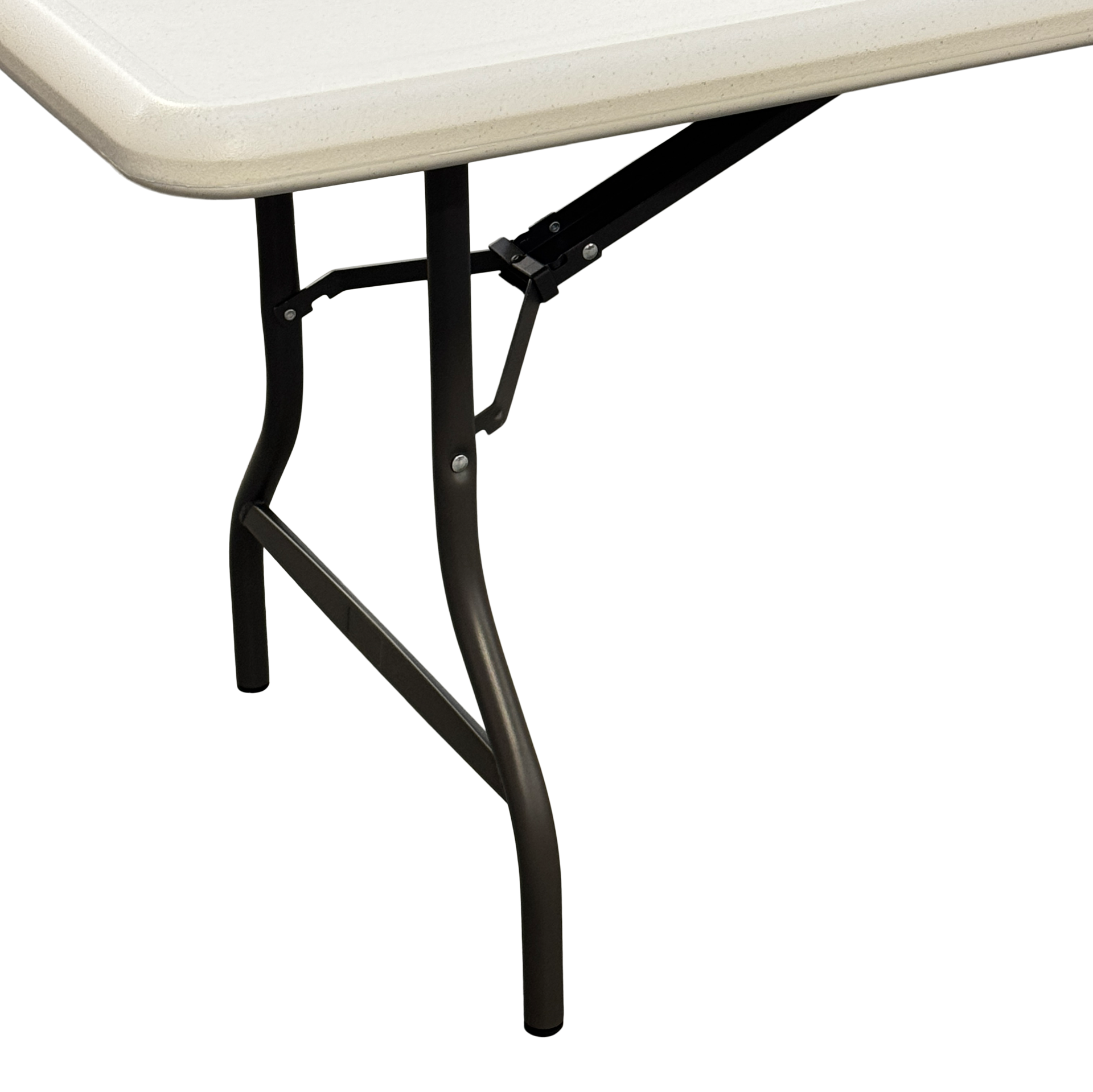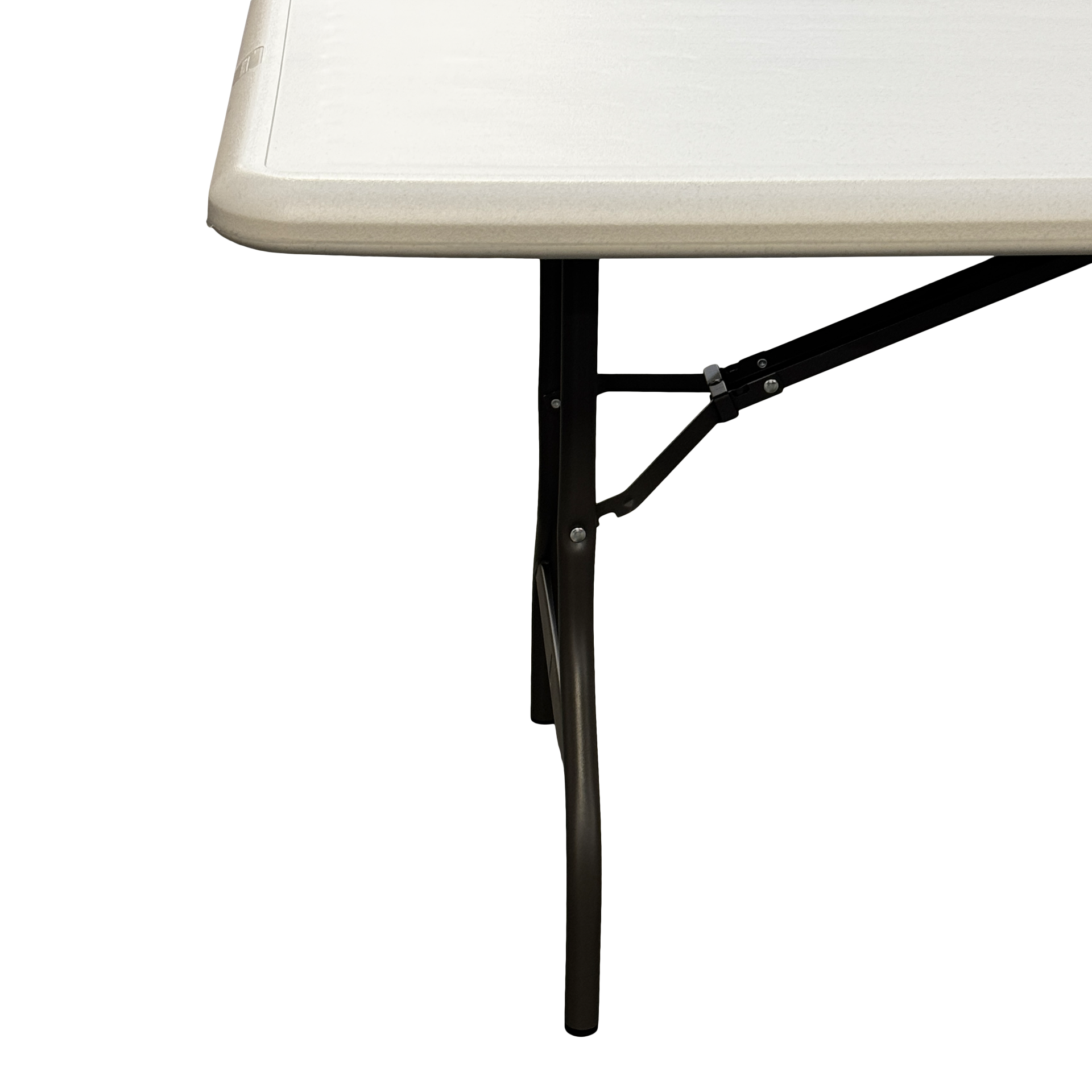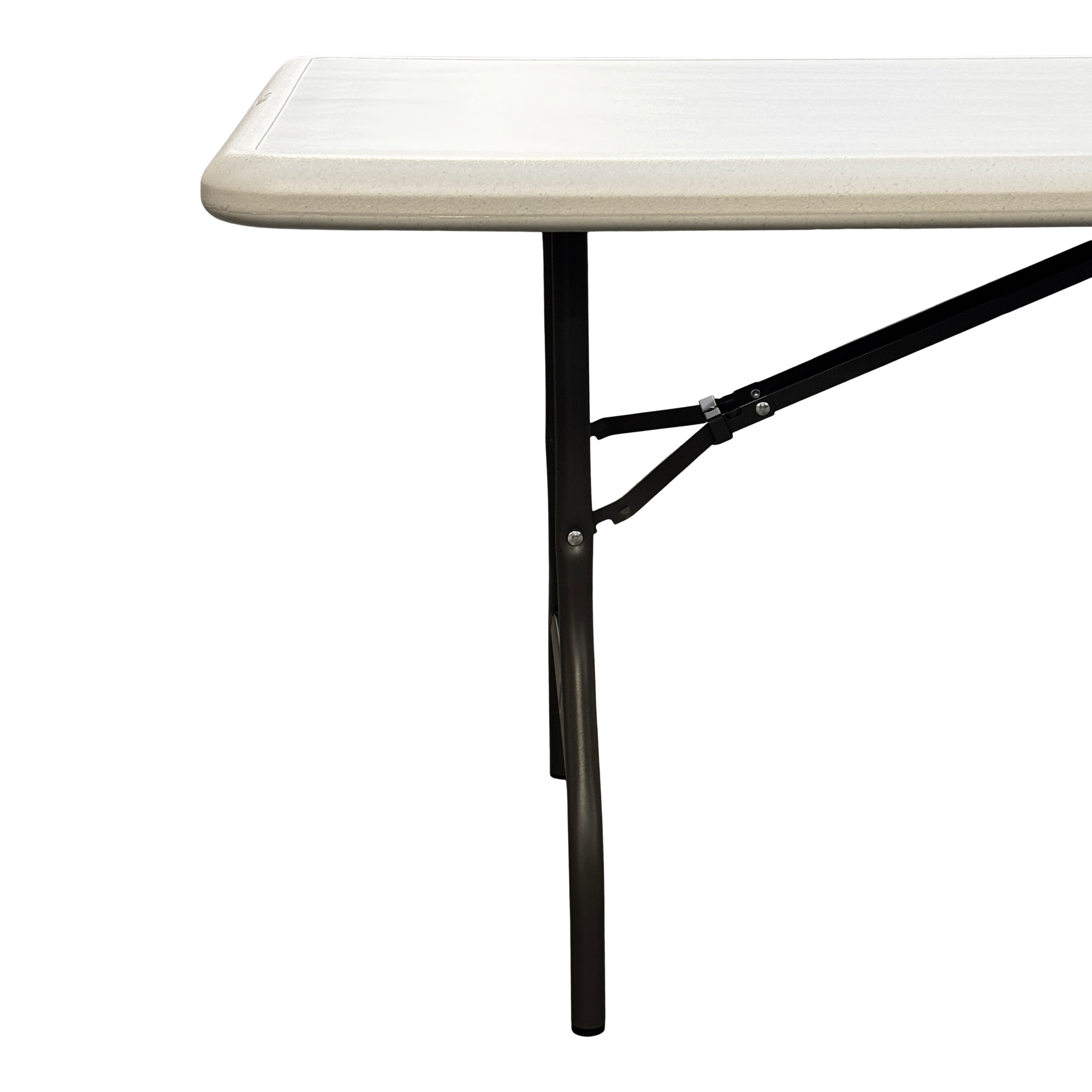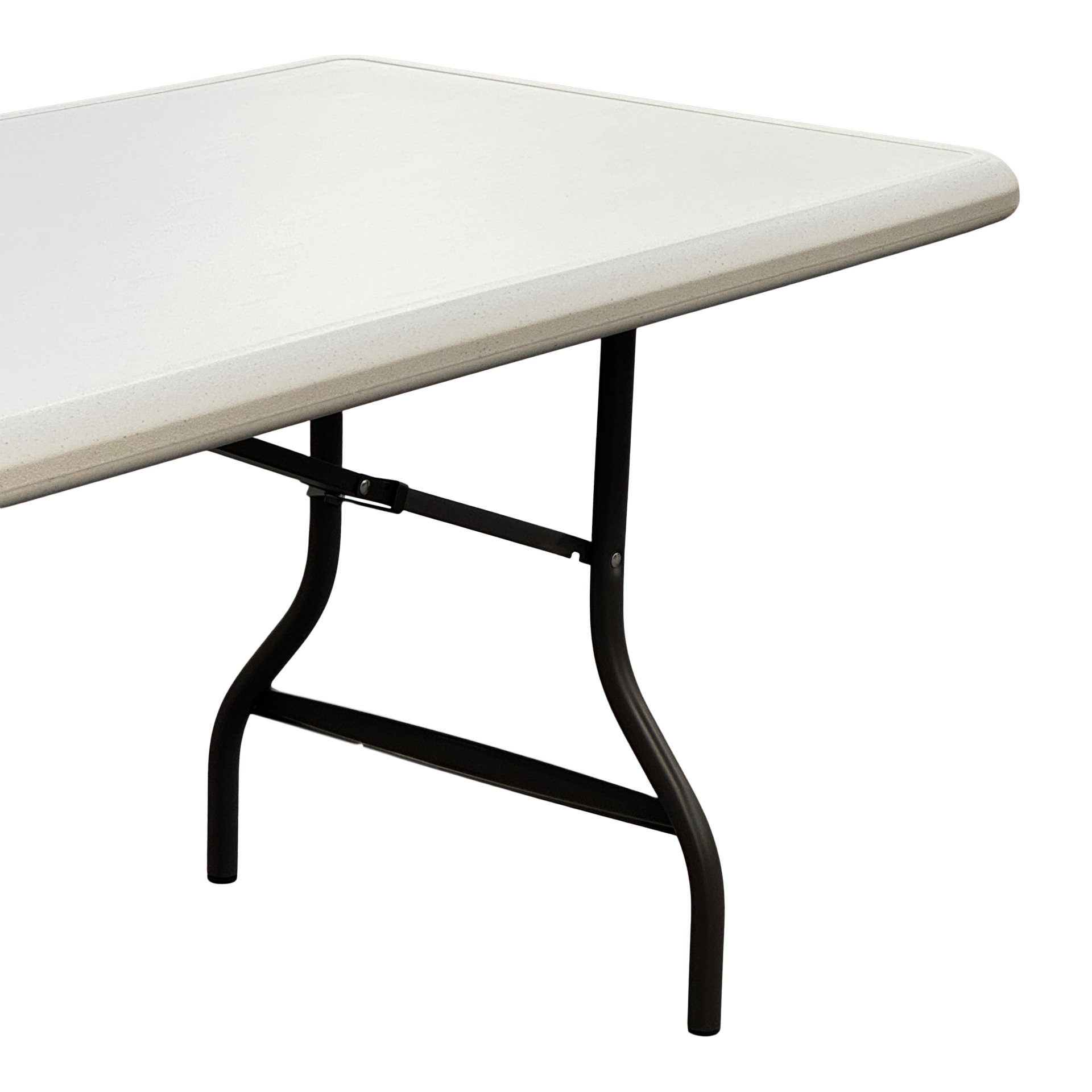 Easy-to-carry commercial-grade SKILCRAFT® Blow-Molded Folding Tables for indoor and outdoor use are made of high-density polyethylene with contemporary beveled radius edged tops. Tables weigh 30% less than standard wood laminate folding tables but are far more durable with heavy-gauge, gray powder-coated steel legs, non-mar plastic feet, and cross bracing that folds into the underside cavity for safe storage and easy transport. Tables clean easily; resist dents, scratches, rust, stains, and warping; and carry a 5-year limited warranty. Made with tops of approximately 35% pre-consumer recycled content and all parts recyclable at end of life. TAA and Berry Amendment-compliant tables meet BIFMA standards. Made in America.