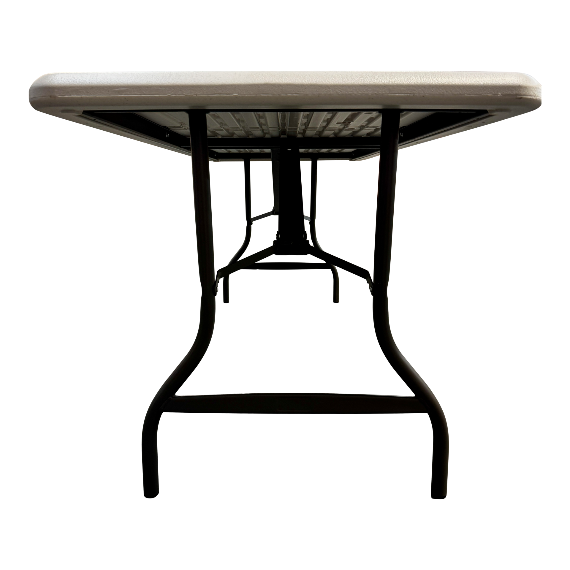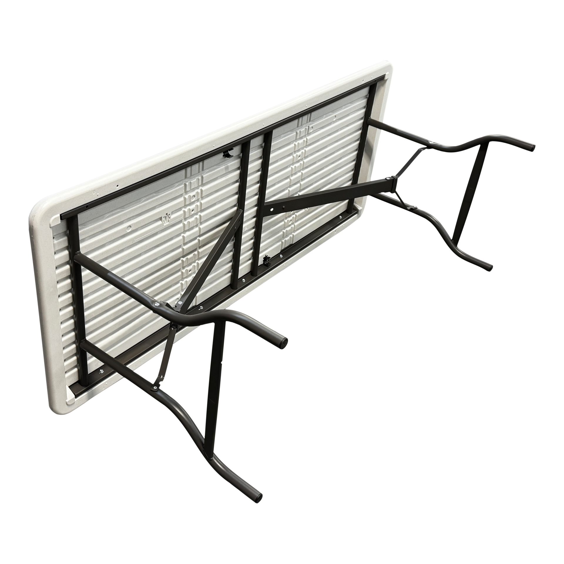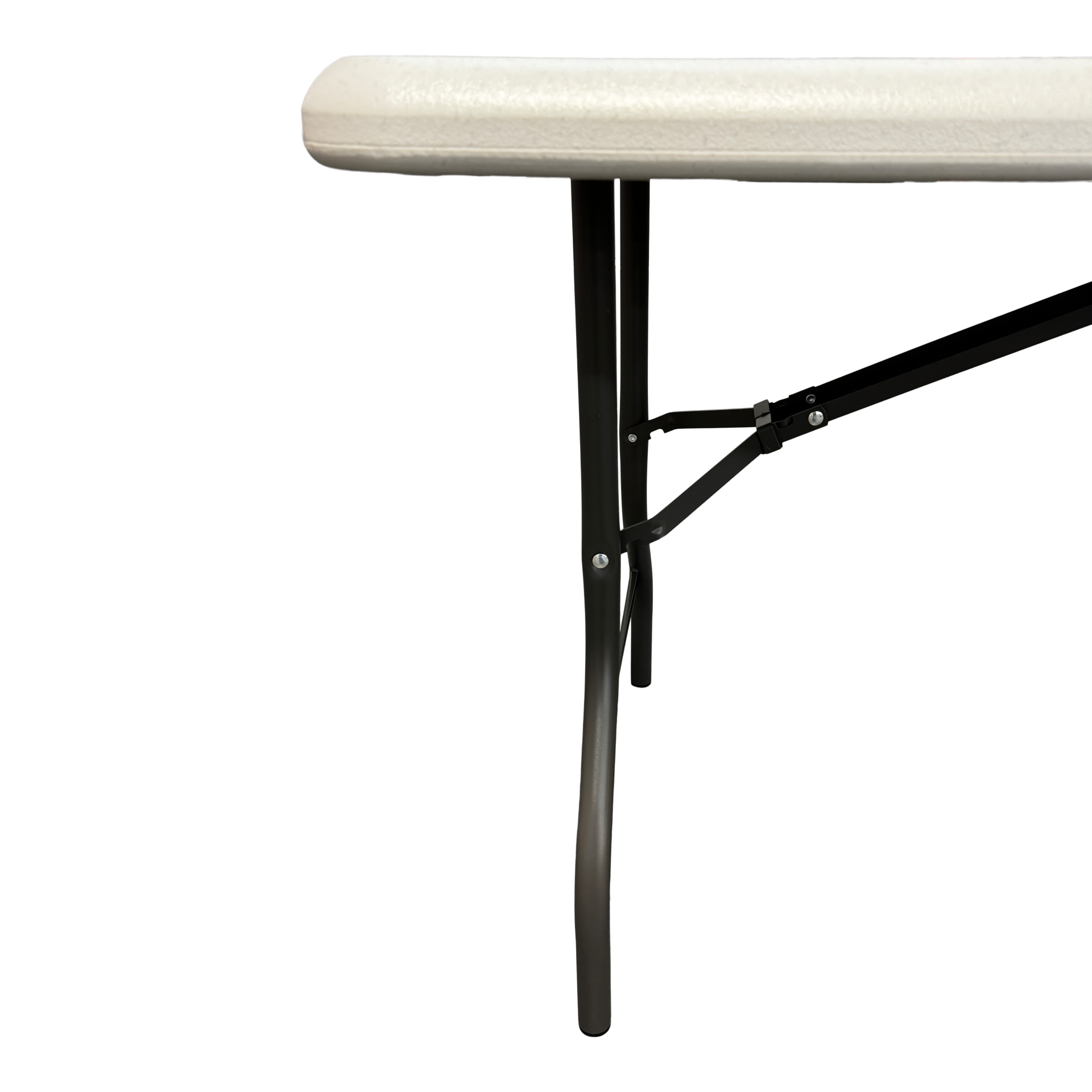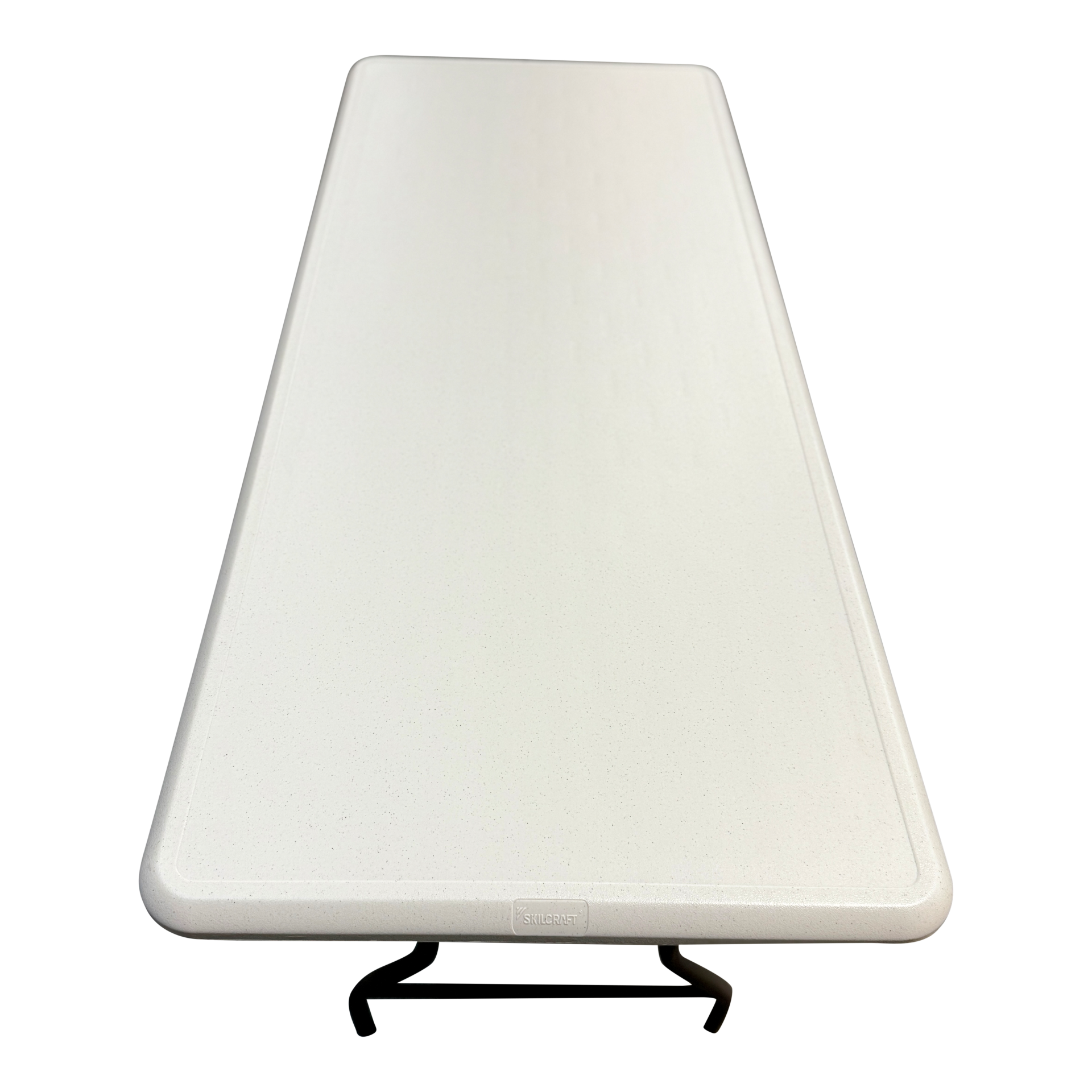 Easy-to-carry commercial-grade SKILCRAFT® Blow-Molded Folding Tables for indoor and outdoor use are made of high-density polyethylene with contemporary beveled radius edged tops. Tables weigh 30% less than standard wood laminate folding tables but are far more durable with heavy-gauge, gray powder-coated steel legs, non-mar plastic feet, and cross bracing that folds into the underside cavity for safe storage and easy transport. Tables clean easily; resist dents, scratches, rust, stains, and warping; and carry a 5-year limited warranty. Made with tops of approximately 35% pre-consumer recycled content and all parts recyclable at end of life. TAA and Berry Amendment-compliant tables meet BIFMA standards. Made in America.