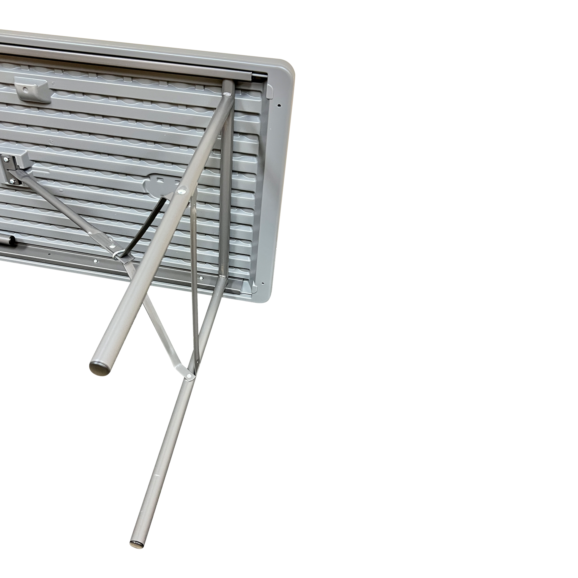 Easy-to-carry commercial-grade SKILCRAFT® Blow-Molded Folding Tables for indoor and outdoor use are made of high-density polyethylene with contemporary beveled radius edged tops. Tables weigh 30% less than standard wood laminate folding tables but are far more durable with heavy-gauge, gray powder-coated steel legs, non-mar plastic feet, and cross bracing that folds into the underside cavity for safe storage and easy transport. Tables clean easily; resist dents, scratches, rust, stains, and warping; and carry a 5-year limited warranty. Made with tops of approximately 35% pre-consumer recycled content and all parts recyclable at end of life. TAA- and Berry Amendment-compliant tables meet BIFMA standards. Made in America.