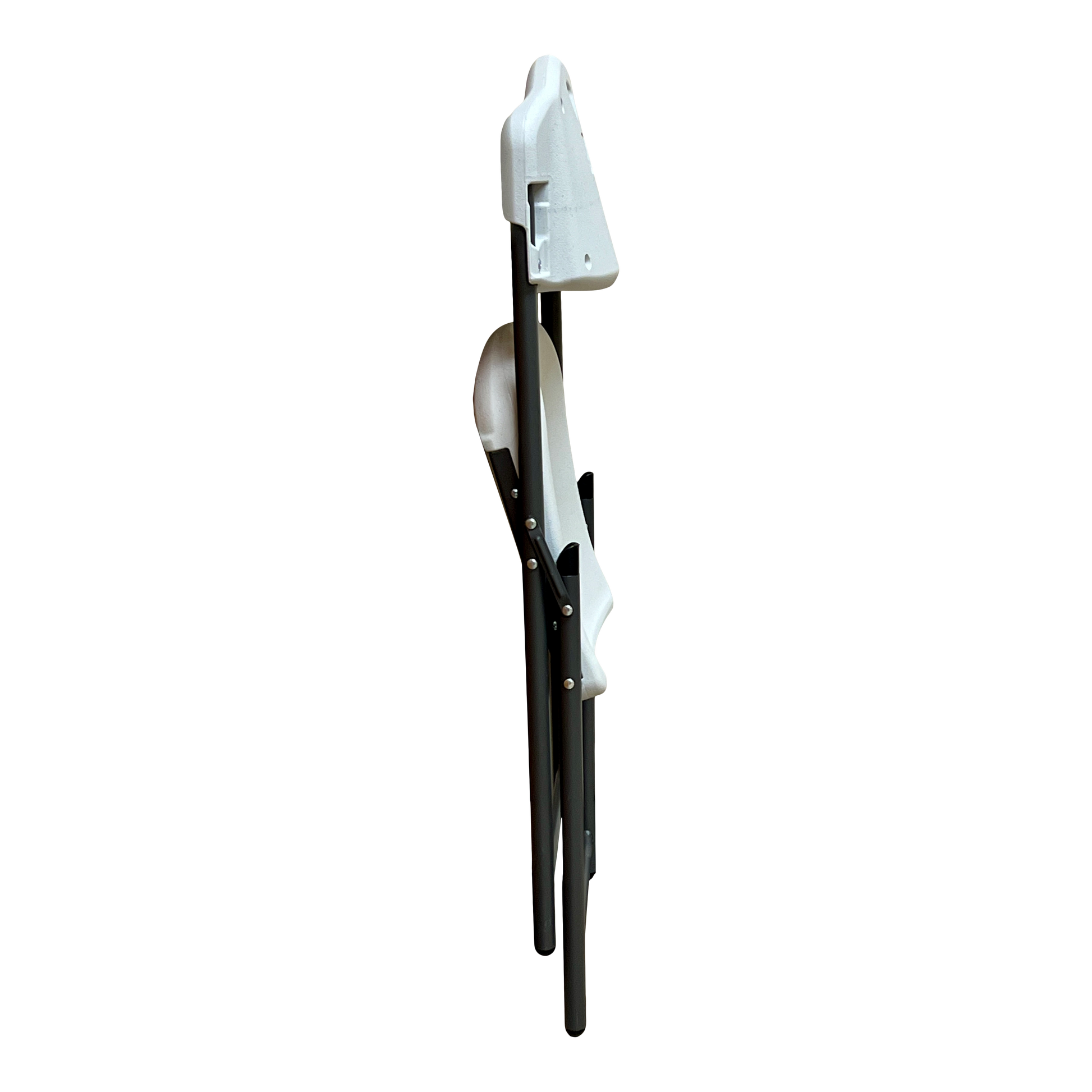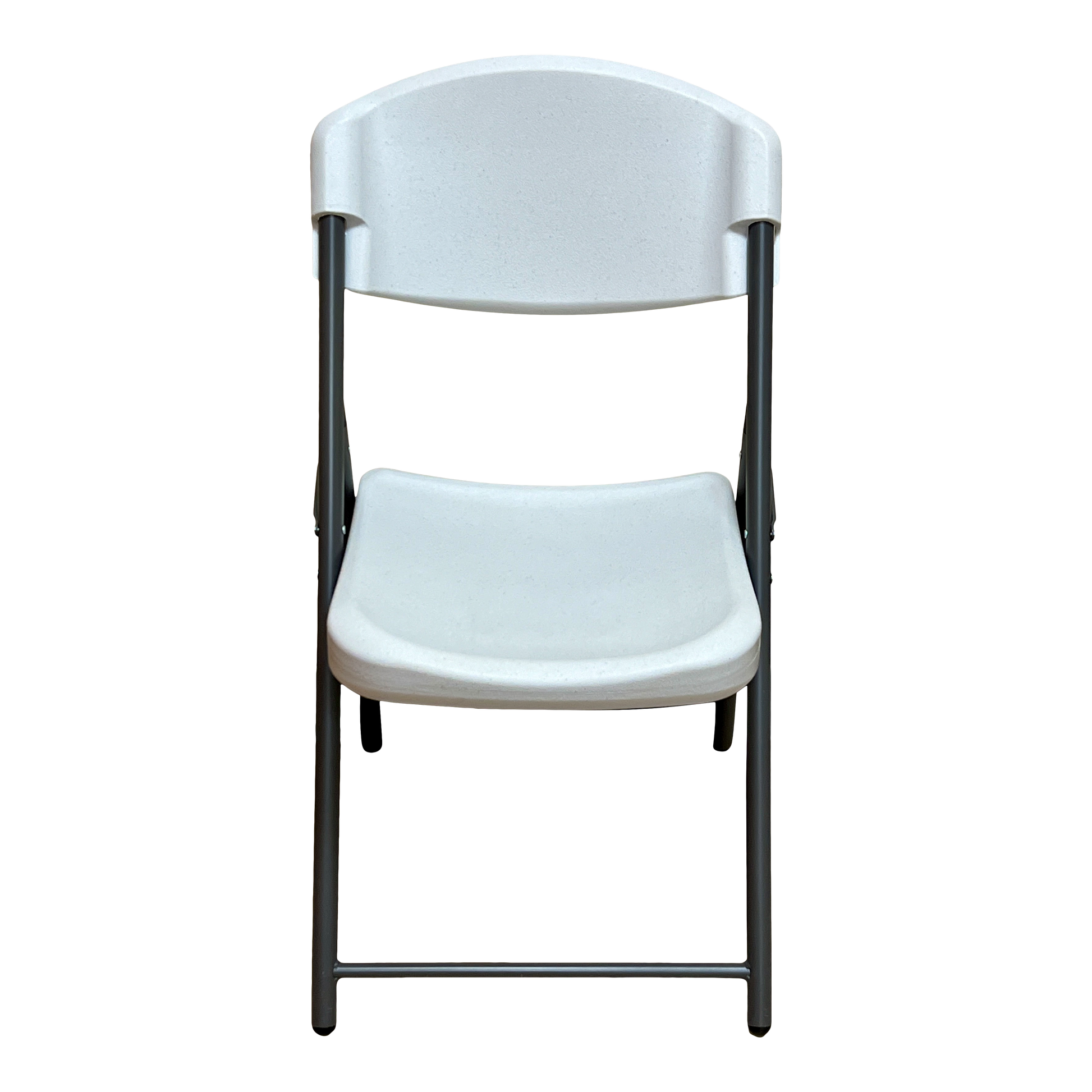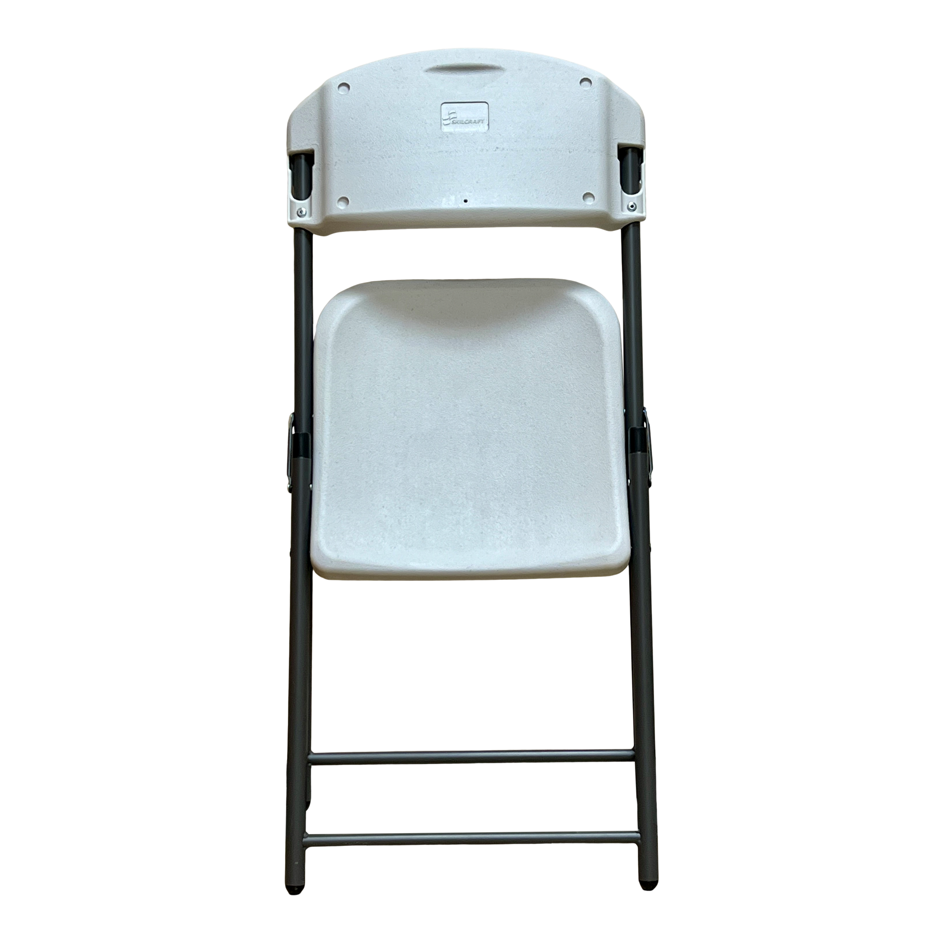 Lightweight commercial grade folding chairs for indoor and outdoor use are ergonomically contoured with an extra wide seat for comfort and plastic feet that won't mar floors. Made of blow molded, high-density, polyethylene with powder coated heavy-gauge steel frame and leg assemblies for durability and portability, these chairs resist dents, scratches, and scuffs, yet nest for easy storage. 350-lb weight capacity. Limited 5-year warranty. Made in America.